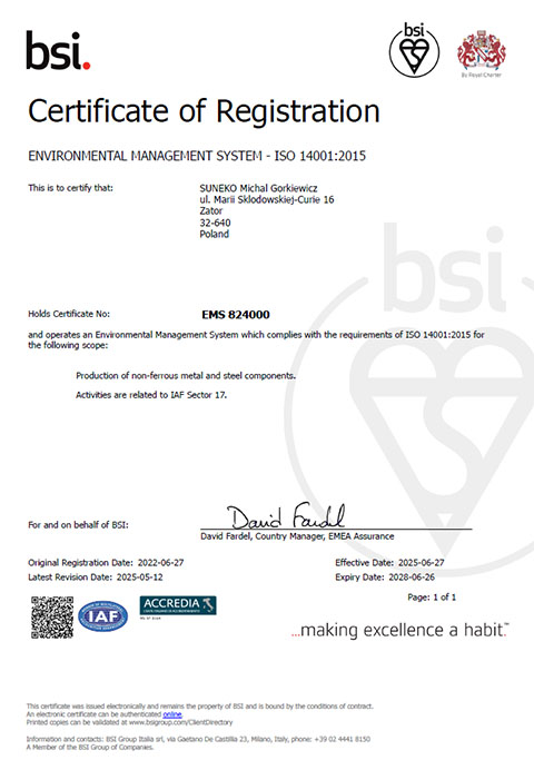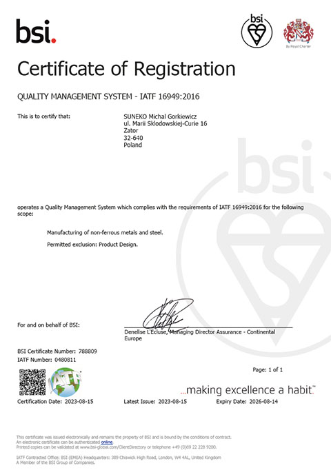 Priorytet ukierunkowany na pełną satysfakcję naszych Klientów, stabilność i dobrą pozycję firmy na rynku realizujemy poprzez pełną odpowiedzialność wszystkich działów za spełnienie wymagań IATF 16949, normy ISO 9001, ISO 14001 oraz dodatkowych wymagań Klientów, prawnych i zobowiązań zgodności. Dysponujemy laboratorium pomiarowym spełniającym najwyższe standardy wymagań laboratorium wewnętrznego IATF 16949. Na naszym wyposażeniu dysponujemy maszyną współrzędnościową stykowo – optyczną, skanerem pomiarowym do elementów obrotowych oraz urządzeniami do dokładnych pomiarów chropowatości oraz powłok cynkowanych.