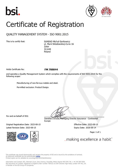 Jako firma "SUNEKO" deklarujemy jakość naszych produktów jako najwyższy priorytet w swej działalności na poziomie bezwzględnie odpowiadającym założonych i ustalonych z klientem wymagań.